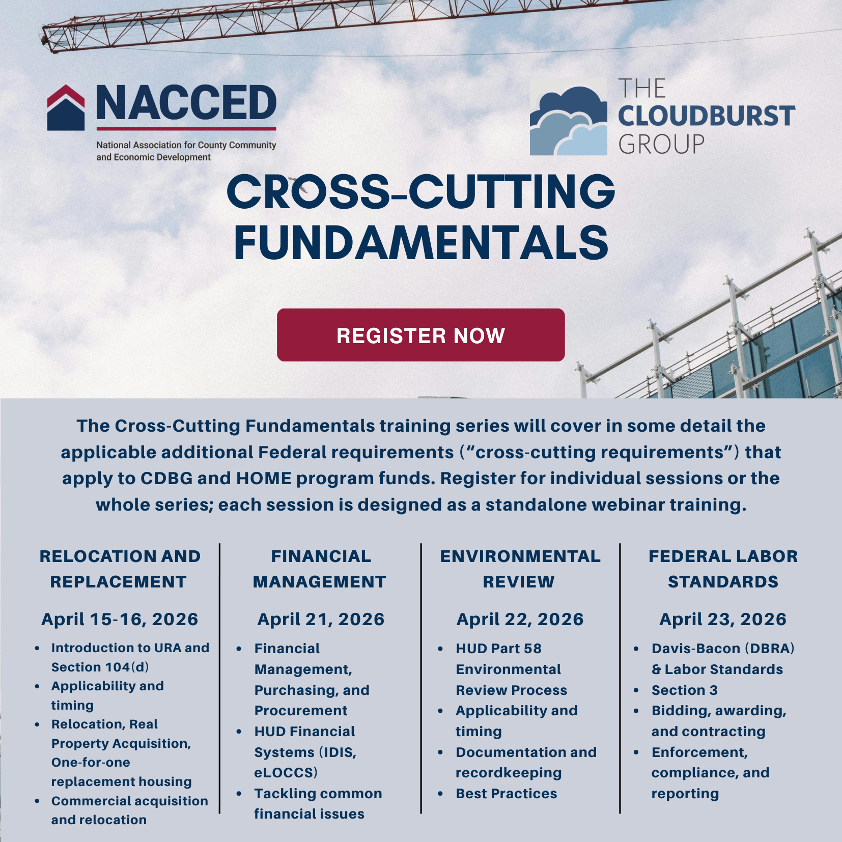 The Cross-Cutting Fundamentals training series will cover in some detail the applicable additional Federal requirements (“cross-cutting requirements”) that apply to CDBG and HOME program funds. Register for individual sessions or the whole series; each session is designed as a standalone webinar training.
