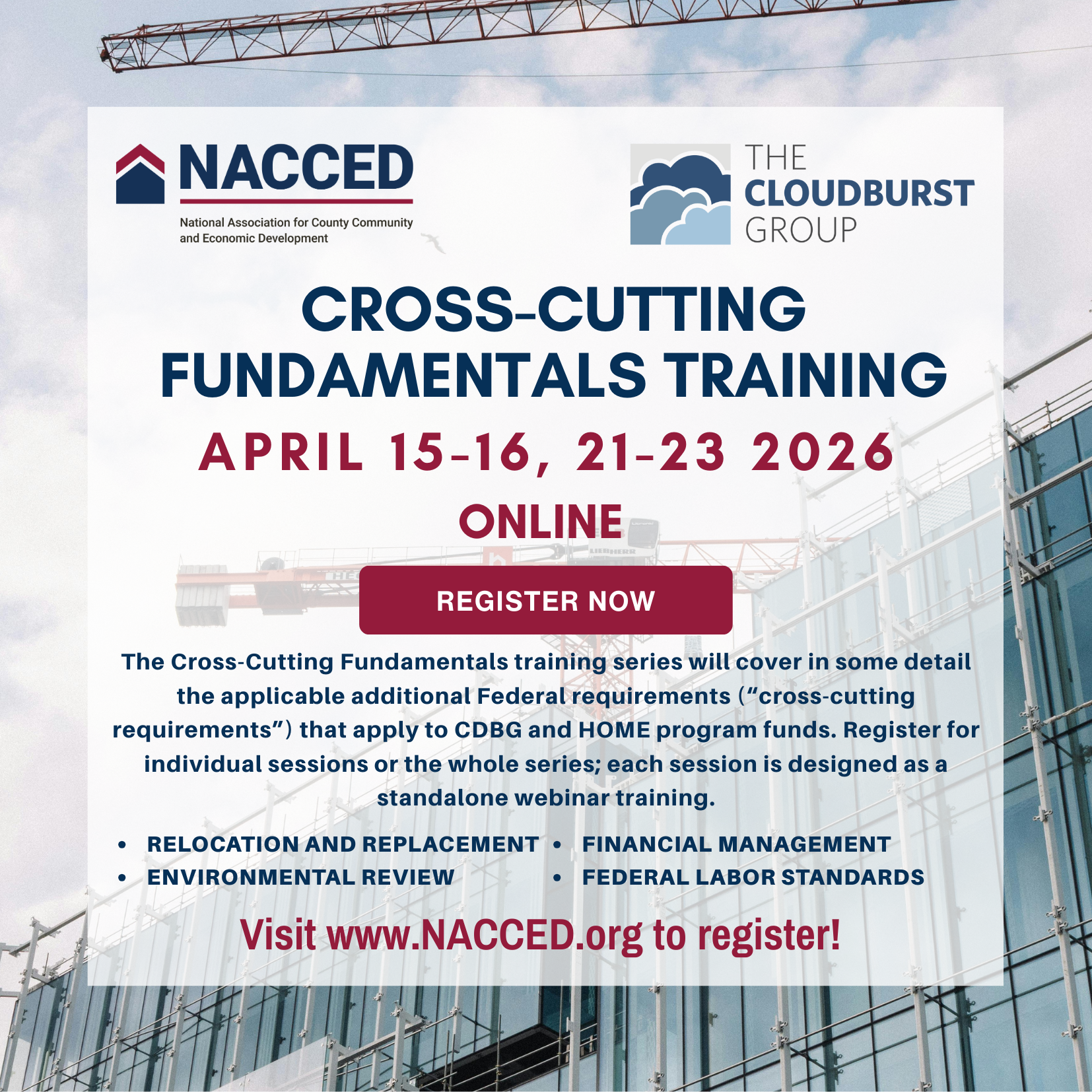 The Cross-Cutting Fundamentals training series will cover in some detail the applicable additional Federal requirements (“cross-cutting requirements”) that apply to CDBG and HOME program funds. Register for individual sessions or the whole series; each session is designed as a standalone webinar training.